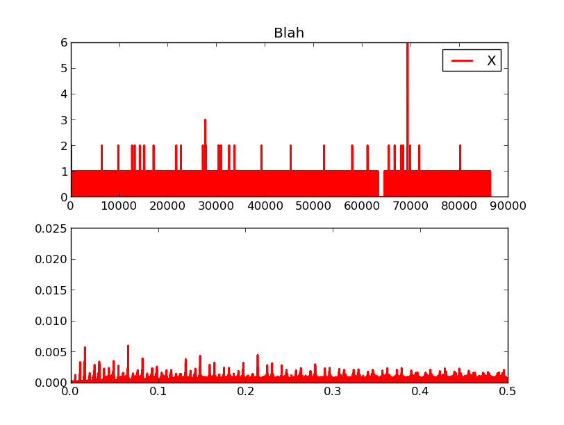 pylab.plot(frq,abs(y),'k',color='red',linewidth=2)看起来,特定的频率正在被识别(乍一看,与google.com的流量有很大的不同)。我一直想弄清楚如何从下面的图表结果到改进算法,并通过编程确定通信的基本频率是否看起来更像一台机器,而不是人类。如有任何想法或在线参考,将不胜感激。
