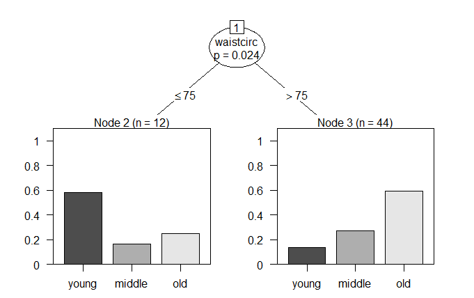 bf$agegrp<-ifelse(bf$age<=40, "young", ifelse(bf$age>40 & bf$age<55,"middle", "old"))这是ctree分析: