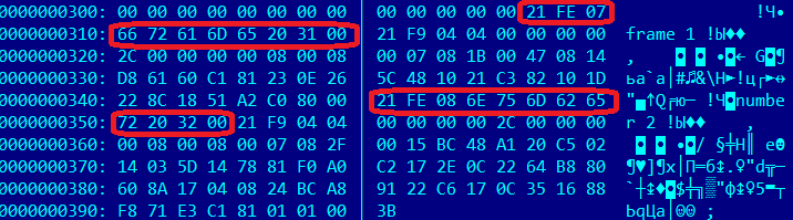 我创建了一个非常简单的GIF文件,其中两个8x8帧,第一个输入“Frame1”,第二个输入“数字2”。产生了这个妖怪堆: