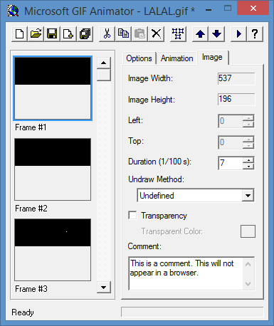 我期待着在gif文件的每个帧中存储text的方法。不是打印图像中的文本,而是作为属性添加。有一个由微软制作的旧程序,它能够为每个框架设置文本。