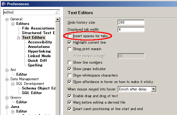 Text Editors。Insert spaces for tabs。