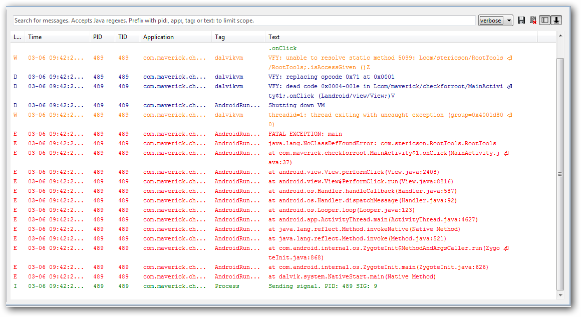 在下面的代码中,我尝试使用roottools检查根访问。没有任何语法错误,但是每当我单击"Check“按钮时,就会收到一条”应用程序意外停止“的消息。请帮帮忙。