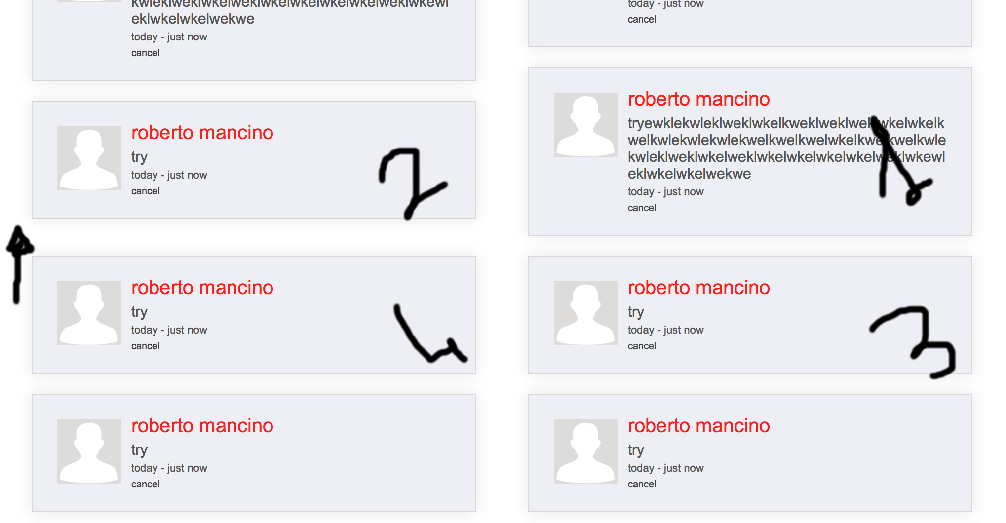 <div data-post-id="91" class="post" id=""><img src="/images/male_profile.png" class="postImg"> <div class="formatted-text"><h4>roberto mancino</h4> <h5>tryewklekwleklweklwkelkweklweklweklwkelwkelkwelkwlekwlekwlekwelkwelkwelwkelkwelkwelkwlekwleklweklwkelweklwkelwkelwkelwkelweklwkewleklwkelwkelwekwe</h5><h6>today - <span>about 10 minutes ago</span></h6><a style="font-size:11px;" class="cancelPost">cancel</a></div></div>