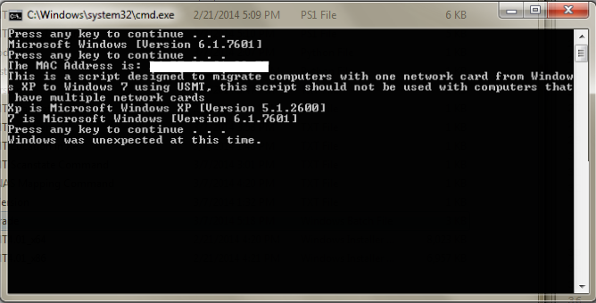 我正在编写一个批处理脚本,使用USMT将计算机从XP升级到7。由于USMT有一个扫描状态组件,需要在操作系统升级之前运行,而加载状态计算机必须在操作系统升级后运行,所以我试图使用if语句检查操作系统是什么,然后运行正确的命令。我是批处理文件的新手,但从我一直读到的所有东西来看,我似乎正在正确地编写它,但我显然是在搞砸了。我得到了一个"Windows是意想不到的在这个时候的错误。“我还知道,由于我包含的暂停命令,变量被正确地设置了。我还尝试使用IF %WINVERSION% == %XP% goto XPTRUE/WIN7TRUE,并将括号中的所有内容都封装在:XPTRUE/WIN7TRUE下面,但这会产生相同的错误。