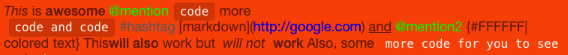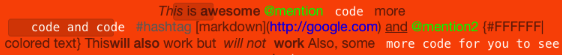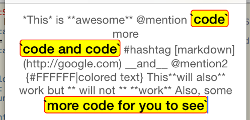 @"*This* is **awesome** @mention `code` more \n `code and code` #hashtag [markdown](http://google.com) __and__ @mention2 {#FFFFFF|colored text} This**will also** work but ** will not ** **work** Also, some `more code for you to see`" attributes:attributes];