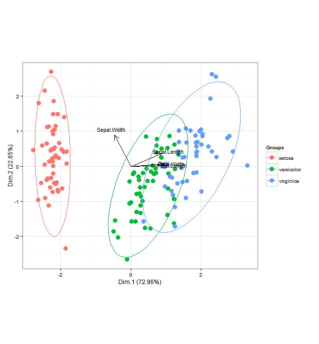 (不同类型的缩放是可能的,例如行主体(表单双图)、列主体(协方差双图)、对称双图等,这些都是goord目前不支持的。尽管编辑ggord.PCA S3方法或goord.default方法来支持这一点很容易。)