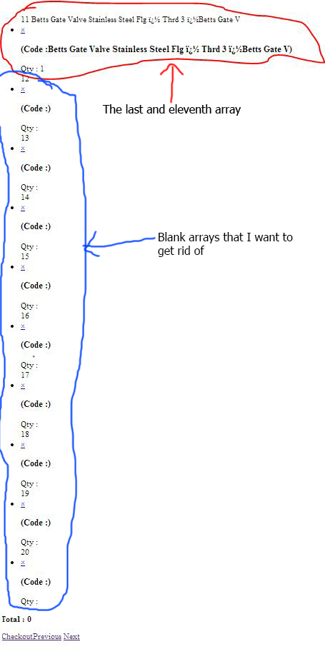 我有一个PHP页面,它使用分页显示会话的所有数组。分页每页显示十个数组。目前,我的会话有11个数组。我的问题是,当我转到包含第11个数组的第二个分页页面时,它会继续显示更多的空数组。分页一直在进行,大概有一百万。我希望它在第十一数组的右边结束,最好是。例如,如果有12个数组,我希望它结束并停止在第12个数组上分页。下面是我的问题的一张图片: