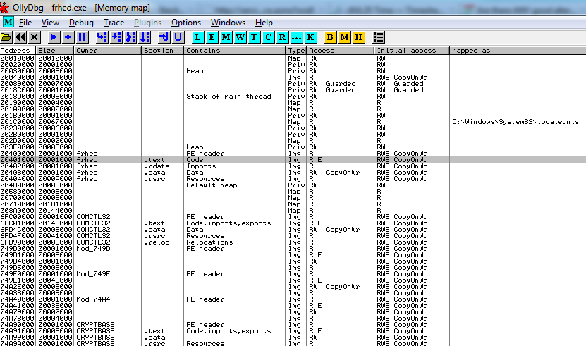 memory是否有类似于OllyDbg的内存映射功能?如果是这样,我就找不到了。我知道屏幕顶部有一个狭小的条,显示你在地址空间中的位置和内存分配的位置,但我认为这是不够的。这是内存映射在OllyDbg中的样子: