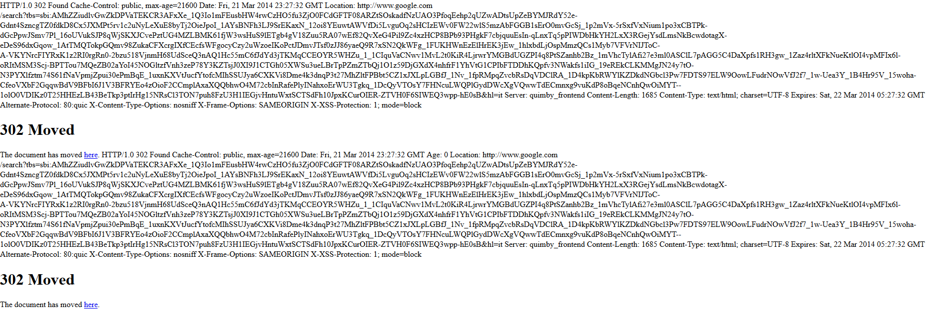HTTP/1.0 302 Found Cache-Control: public, max-age=21600 Date: Tue, 25 Mar 2014 18:30:07 GMT Age: 16 Location: http://www.google.com/search?tbs=sbi:AMhZZisAo2ZcfY19aFUJcEj26M4zKc9ZuxzfsUPzLuUJk-pd-siPwiplqIcGN5tW1XPU16-XFg1EoK7jc5IU3BKoEHYnwZo7RmuhyF5p9qaZwSgq4FKRkNW44JgzTi4Mr8g6ezNMQ6YzaAEQ-uFbPMNzY40NrE3uB7ePm4BGNowF34PiIjLOiVLkWwQ7sRoBVMoVgzBbAP7rDwHee5LyGF8Dq6QOT1TEhsURduPD6exzITyRl77agELdpTFSi-JXDncI6c4KdcuQYSx2LknnIW6nippmpPf3X5OYGn1CFZw13rlFPitLSY0Ang0COuSXKdpBy6B8Dak9QZNZ9VFB4HBRfnMFiyuBvQtyhAg2LeOnRbjnunGB0P1RlwKBF4hRId7wUdTu4Dfab5DQu9hGauLKcd7GcP4g-jQXx_1gymwDdZnPXLzZp1mkjVMX9GFSppj-IRWp3FVVqChsPEzKXdraevuWJFukjUdF87dU_1kLKO23lC8L3kusy05zcq7ZxyF1dHNfQ0vYJeWumtbRosJNuEcqiSyVW_1-bF104HMJLdCA0gr5VyIZolkcZok4W1sgjFYTWvfj6f0proaGE24HSO4Ov2hmhAy9HQUCr3e-KjgqyP4AOtlmI3VsuLu34jKSo0t4tWbb5PVBi1_1oebuv4oisdVdw22a6CRH2tiw8wg6Ya1VgxsXhyj8U7lrQ8cBHVDKlOI6EimXtnELBHyDNQT1Zpsz1hK10GYvFaRNMFd7Rqmg87CLdycgyRV-sYxNWxIu9agNgHTwuU1W-GgeWWcM9noeMwgqMKSGh9lt_1hda3ZWrcA4Y1MeiG55b4ZYvOjcm9t9iIy6LA2S4AjC2X1qZHvJtSqzgfOz8yTuX5jUHqCl0jI1FdOSmqZV1GqQ0uaJfsuchlsWUULfUJBzFiGkAuOqIzU0bpXLNqLHoYPJUPwr66H6jWPFLsWAS9_1GRNj70s30jfbzcS0NUShUvE2meUhlpx-f5M0nmS0zvf-3OQOUkXlYO2VUZ4x9y8G76hHoTkDxqzhhGrgohyFmkUvAWmSkHTBpbP6gek8cyrmBnXuedSV3r2O71G8CUbdHFxfIO8FWlkGj1cUYu60PoKF6hndjZsOlV-dSNXfOTKeC1jPtf5ycXA0s0xLK7_1K0iWxhfmVq62WgQ4O3Prc4b6bcJm8M1Q9xZhhsElisuUyVTN9-dDMNUZ1h0tUe9oGsZYLh9vjEsMokqBXFM_1igHOfgRn4I17Xt8EBMZI9cEjakByjv-g5Pt9tG69RQm765HLhf8VpafvE5Z3BwDpZs4x5uMkVDURT9qcA&hl=en Server: quimby_frontend Content-Length: 1566 Content-Type: text/html; charset=UTF-8 Expires: Wed, 26 Mar 2014 00:30:07 GMT Alternate-Protocol: 80:quic X-Content-Type-Options: nosniff X-Frame-Options: SAMEORIGIN X-XSS-Protection: 1; mode=block