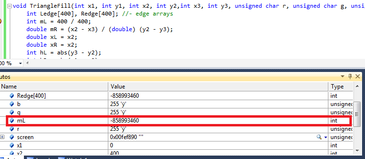 第一步是在堆栈中分配内存。所以,你会看到一个垃圾值。按F10/F11 (第一步),你应该看到1。