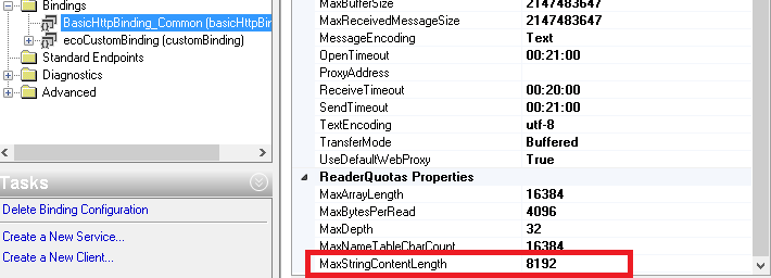 我已经将readerQuotas maxStringContentLength更改为2147483647的WinForms和WCF配置文件,但maxStringContentLength仍然设置为8192。