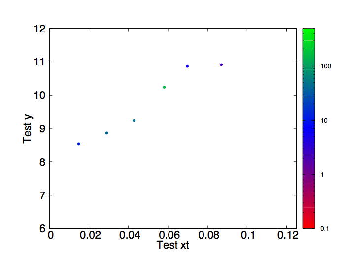 我有多列数据,我试图用z绘制x与y作为调色板的颜色栏。当我用线性比例尺绘制它时,它工作得很好,但是,我想在彩色条上有一个原木刻度。当我这样做时,它正确地绘制了颜色条,但是颜色标度与它正在绘制的值不匹配。列5的数据范围在2到154之间,但是所有的点都被着色为值>100。有人能告诉我以下几点有什么问题吗?