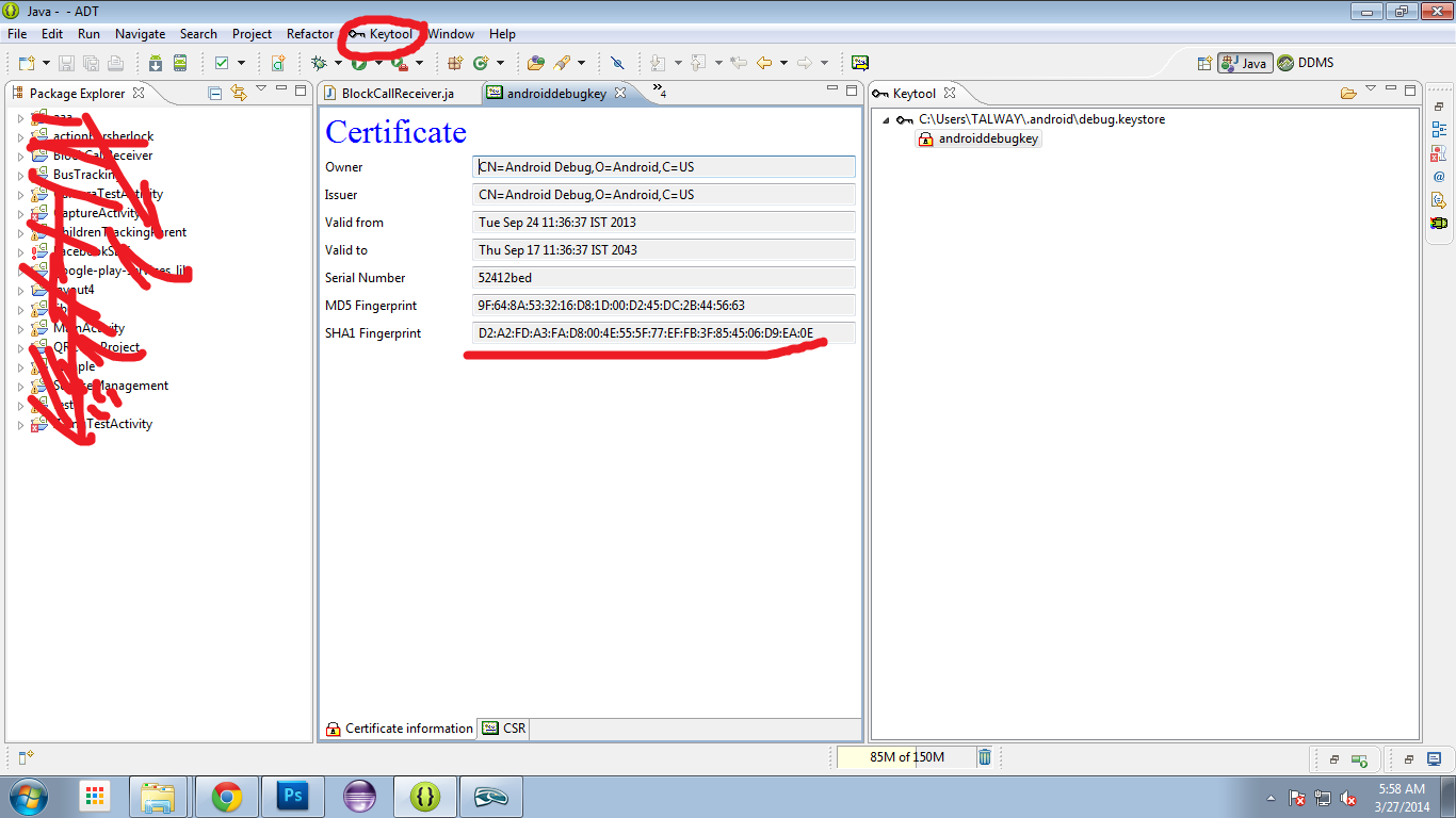 http://keytool.sourceforge.net/update在eclipse中,请使用帮助->安装新软件。将上面的url复制到它并安装it.then,您在eclipse上有一个选项keytool。选择keytool>打开密钥存储库。浏览debug.keystore文件的路径并将密码指定为android。