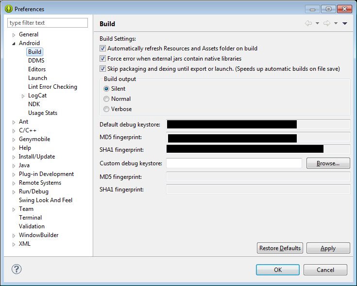 }我知道这个问题已经得到了回答,但我就是这样找到默认密钥存储库的签名的。在Eclipse中,如果您转到Windows -> Preferences -> Android -> Build