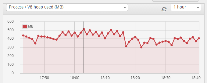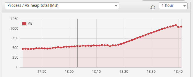 我正在运行一个Node.JS web应用程序,它可以正常工作几个小时,然后在某个随机的时间点上,V8堆突然开始无原因地快速增长,大约40分钟后,这种增长通常停止,进程继续正常运行。