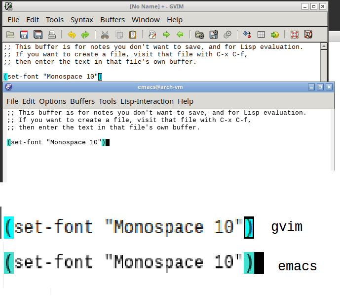 C-x C-c退出Emacs现在检查字体现在看起来是否相同。请注意,GVim可能使用不同的字体呈现器(例如,Cairo、Harfbuzz或其他什么),所以无论如何都会有一些细微的差异。