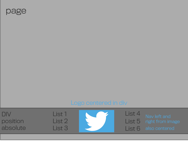 目前不知道如何继续。我在页面底部有一个绝对定位的div元素。我想要放置一个标志,是居中的,也是左和右的标志,我想放置导航(我正在与引导)。下面是我的想法中的一张图片,这样您就可以更好地查看:
