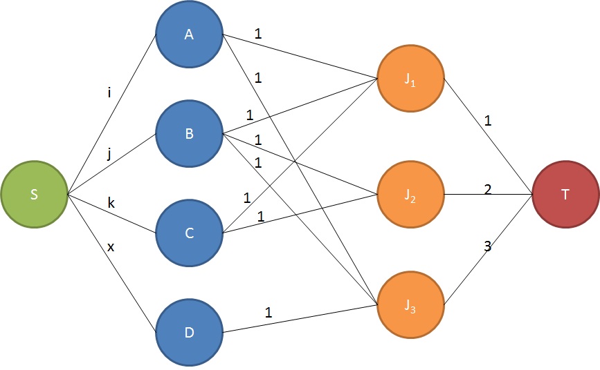 这里需要记住的关键是,People左边的流容量决定了他们可以接受多少个作业,而Jobs右边的流容量决定了分配给这个任务的人有多少。中间的能力不应改变。