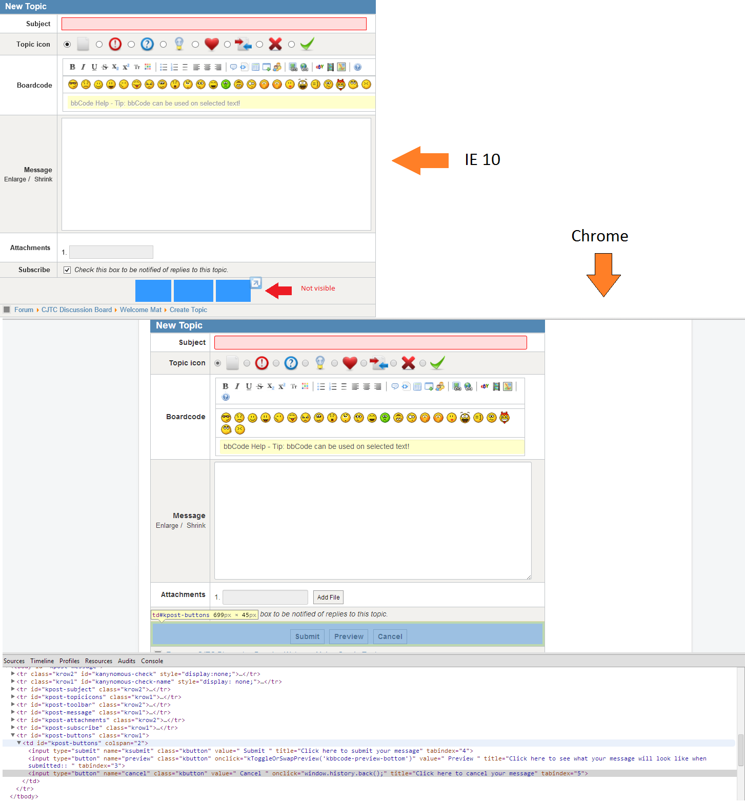 我最近在我们的网站上安装了Kunena,除了我无法看到表单按钮(如submit、preview和IE10中的cancel )之外,一切似乎都在工作。我可以悬停在他们上面,高亮他们,但看不到他们。有人知道解决这个问题的方法吗?我尝试过兼容模式,但这不起作用。唯一起作用的是,如果我进入F-12并进入IE9兼容性。希望下面的图片有所帮助。