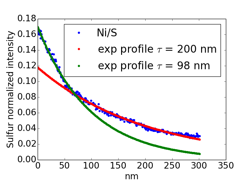 legend(['Ni/S', r'exp profile $\tau$ = 200 nm', r'exp profile $\tau$ = 98 nm'], loc='best', numpoints=1)