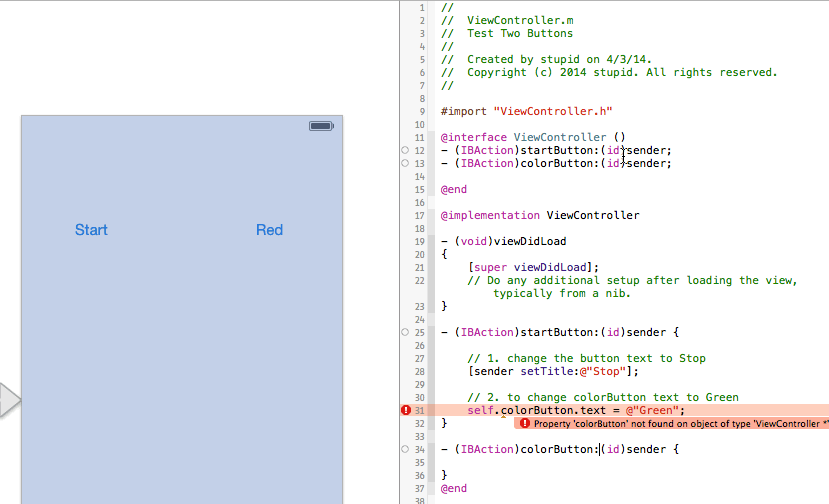 当我按startButton时,我想要将colorButton中的按钮文本更改为@"Green“。