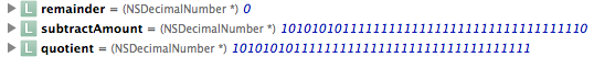 但是,调试器的输出显示您实际上使用的数字要大得多。数一下数字中的有效数字,然后阅读NSDecimalNumber文档的第一段,然后回答您自己的问题。为了便于使用,我将在这里包含文档中的摘要段落。