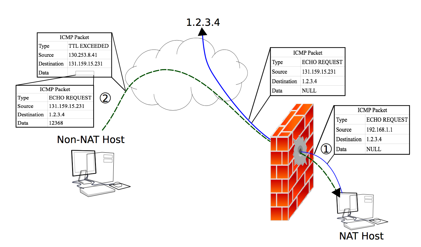服务器将ICMP回送请求数据包发送到固定地址(例如,1.2.3.4),其中不返回回显答复,客户端假装是Internet上的跳转,将ICMP时间超过数据包发送到服务器,期望服务器前端的NAT将ICMP时间超过消息转发给服务器。