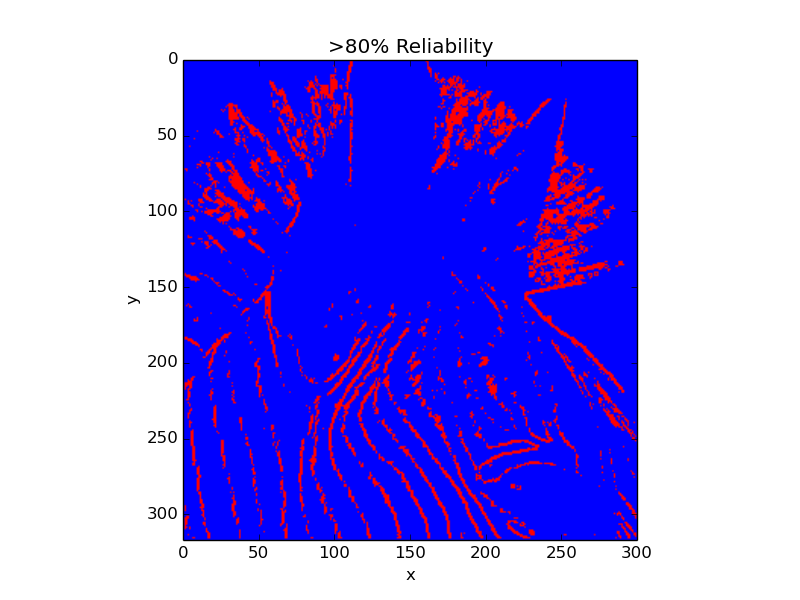 0.99 95100 18577 0 76523可以看到,随着所需的可靠性越来越高,更少的像素具有这种可靠性(更多的像素将是白色的,并且没有一个是红色的)。
