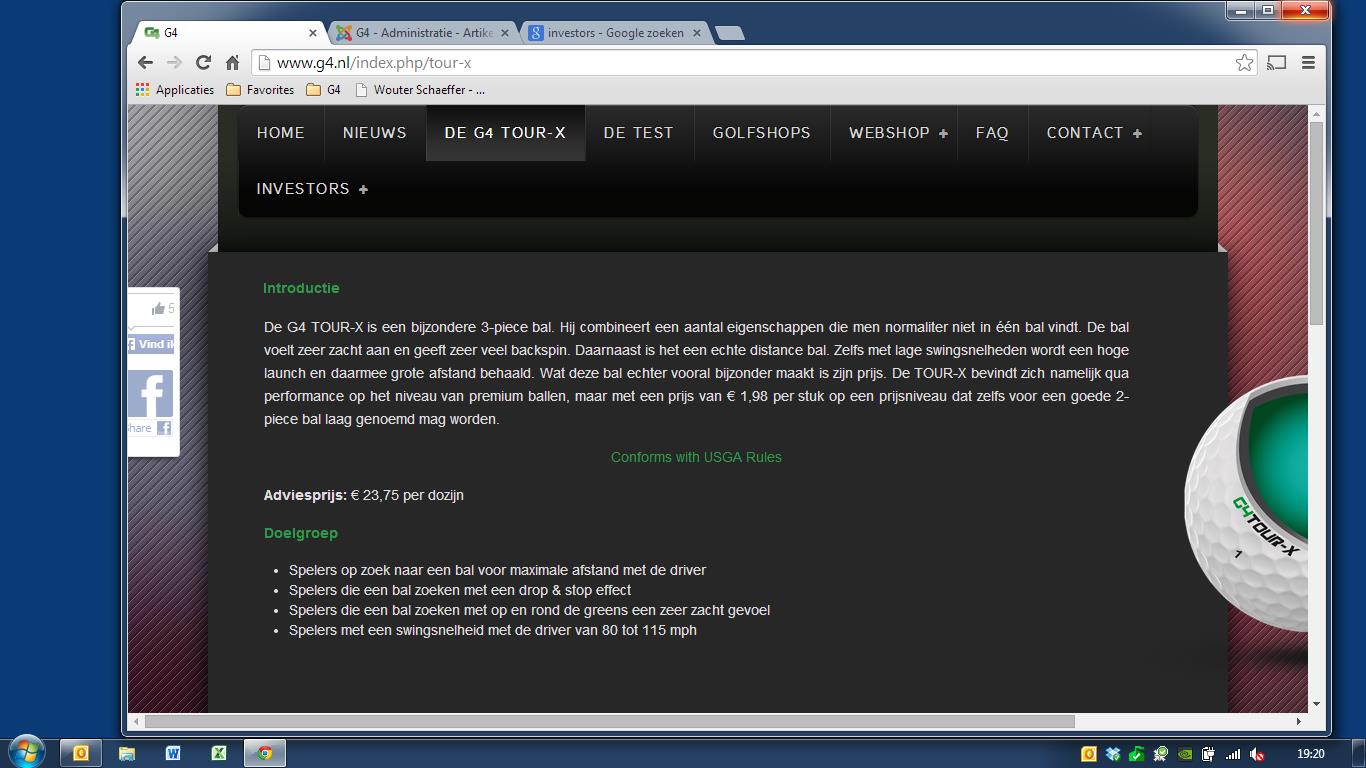 <p style="text-align: justify;">De G4 TOUR-X is een bijzondere 3-piece bal. Hij combineert een aantal eigenschappen die men normaliter niet in één bal vindt. De bal voelt zeer zacht aan en geeft zeer veel backspin. Daarnaast is het een echte distance bal. Zelfs met lage swingsnelheden wordt een hoge launch en daarmee grote afstand behaald. Wat deze bal echter vooral bijzonder maakt is zijn prijs. De TOUR-X bevindt zich namelijk qua performance op het niveau van premium ballen, maar met een prijs van € 1,98 per stuk op een prijsniveau dat zelfs voor een goede 2-piece bal laag genoemd mag worden.</p>
