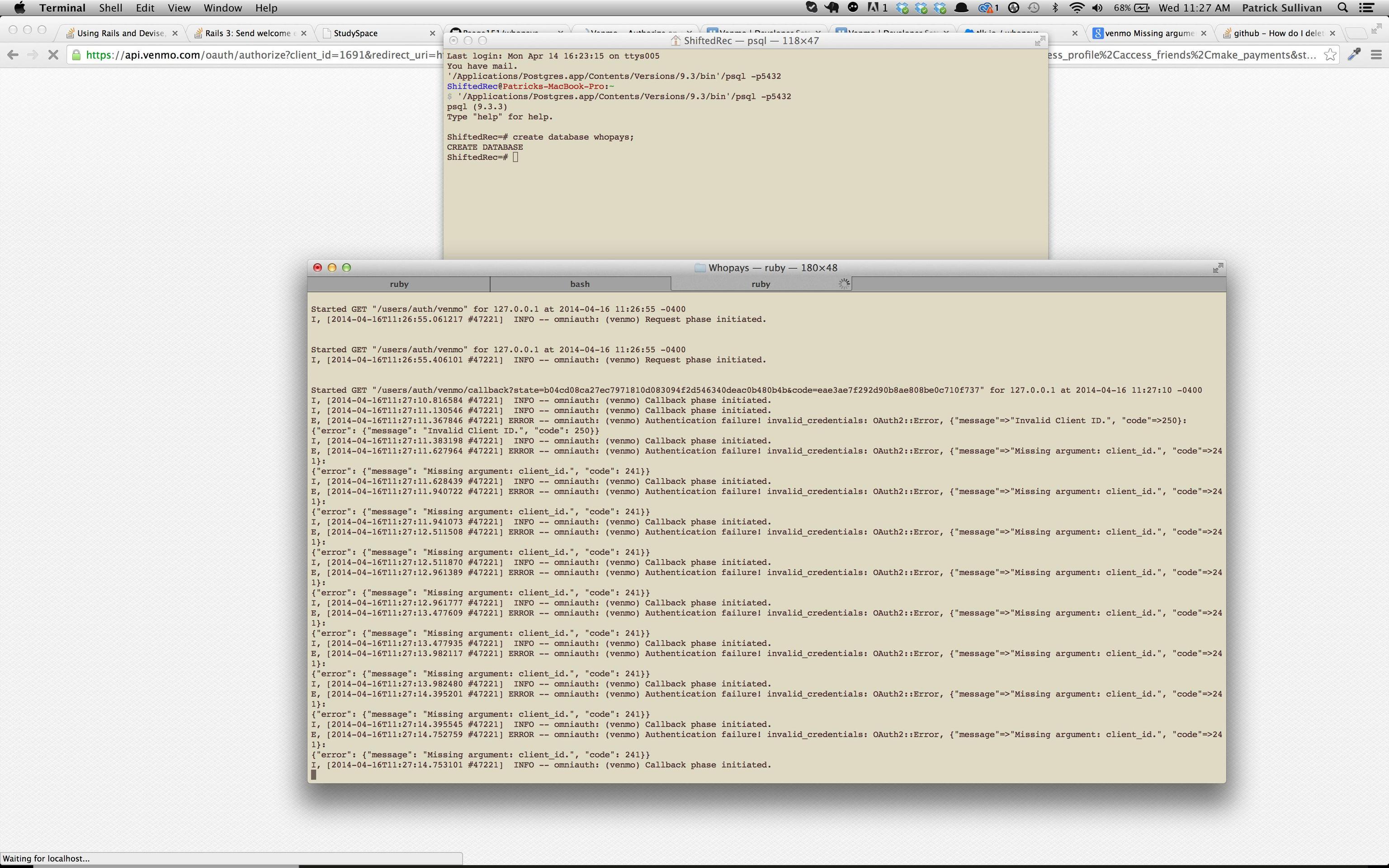 一开始,我甚至看不到venmo的登录。我删除了初始化器中id和密钥周围的ENV和括号,然后我可以看到登录。当我提交并返回调用时,我得到了一个错误:(我认为它会不断地重试.我必须手动关闭服务器)