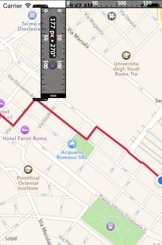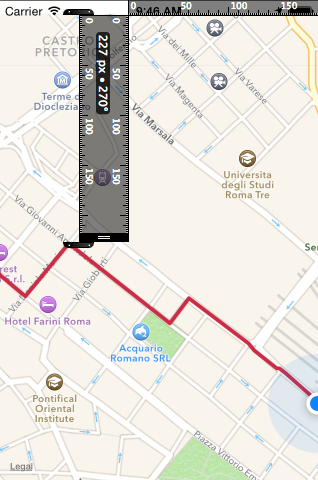 现在,我的目标只是告诉mapView在一个框架内画出这条路线,上面写着"64点,高度80分,宽320点“,我找不到一个简单的方法,恐怕我遗漏了一些东西。我不想通过改变区域的纬度来玩游戏,因为内容大小可能不同(可能有一个更小或更大的显示路线)。我错过了什么,有什么简单的方法可以做到这一点?为什么没有正确地计算这些插孔?