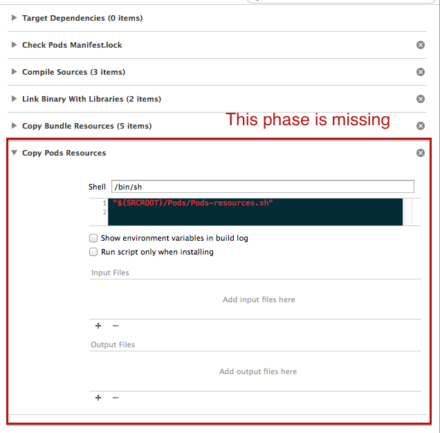 由于某种原因,在构建阶段中缺少了一个阶段。但我不知道为什么。所以,我不得不再次用pod install添加这个阶段。