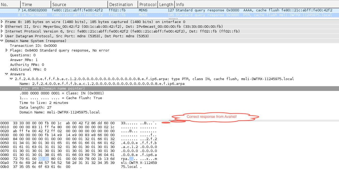 特别是,avahid生成的反向mDNS响应只包含0个查询和1个答案(主机名类型),如所附的wireshark屏幕截图所示。