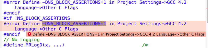 #endif这将检查是否已经定义了NS_BLOCK_ASSERTIONS宏。因为没有设置NS_BLOCK_ASSERTIONS,所以您得到了错误。#error之后的消息是告诉您如何解决问题。