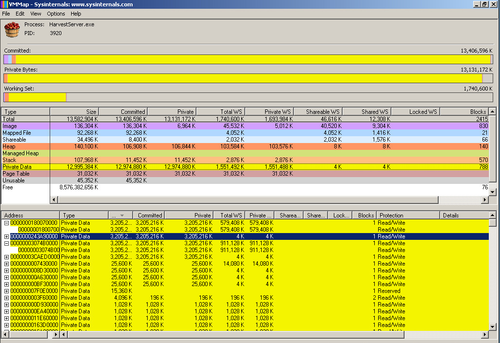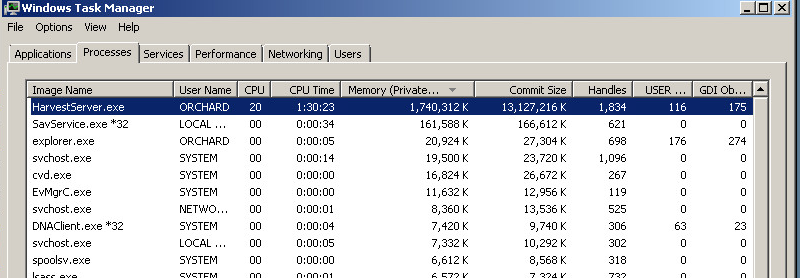 最让我担心的是,这个程序看起来并没有使用它所要求的所有内存。我还没有看到私有工作集内存超过4GB。当用户抱怨速度慢和锁定工作站时,我一直在观察服务器,而且它仍然没有使用所有已提交的内存。
