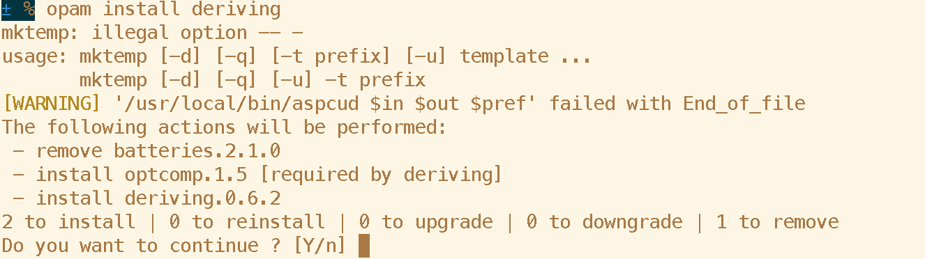 然而,当我使用opam在我的Mac上安装软件包deriving时,它似乎会首先删除batteries包,然后它将开始安装deriving。