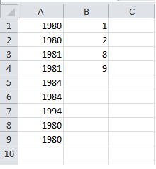 =MATCH(1980, A1:A9,0 )在B2细胞中:B10: