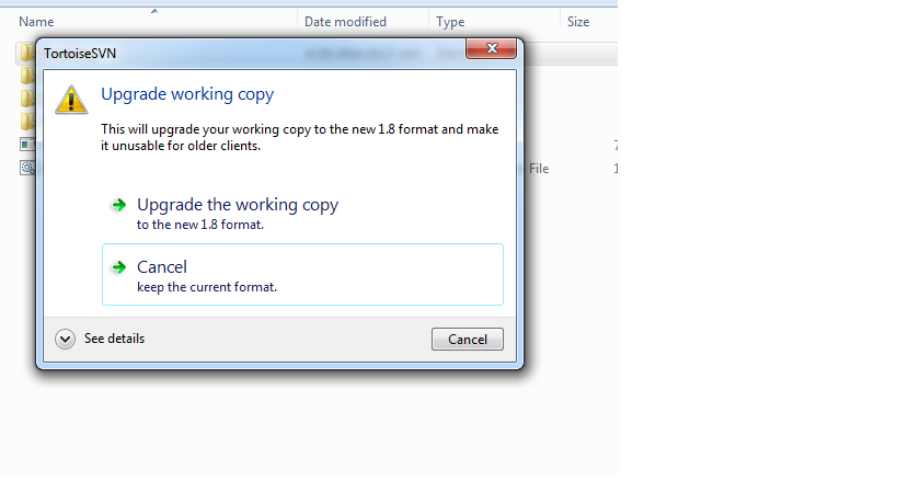 安装新窗口后,并安装最新的svn和Tortois,当尝试更新我的工作副本时,它会警告我应该使用