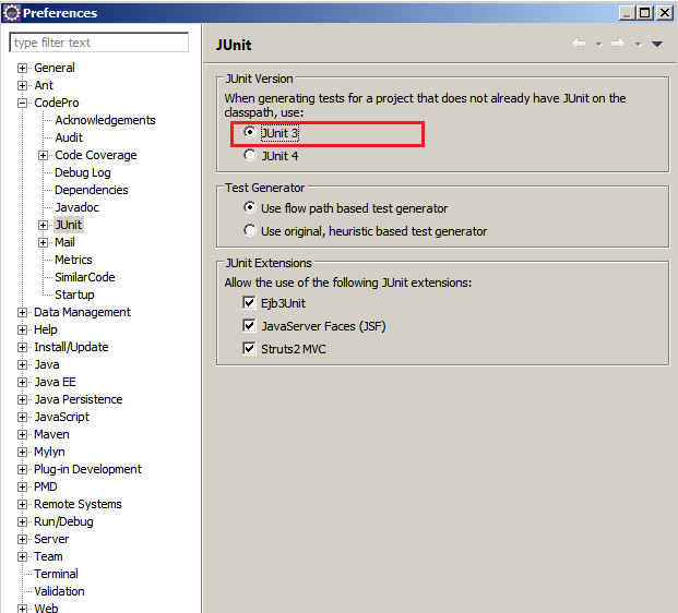 我正在使用codePro工具来生成junit。由于我使用的是JDK1.4,所以在junit3设置中选择了codePro。