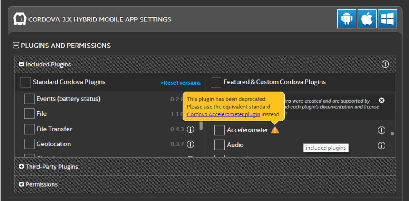 因此,答案是肯定的--您可以同时使用这两种API,而且您可能会注意到,有些API (如Accelerometer、Geolocation或Base API)已被废弃,英特尔建议使用Cordova API代替这些特性。