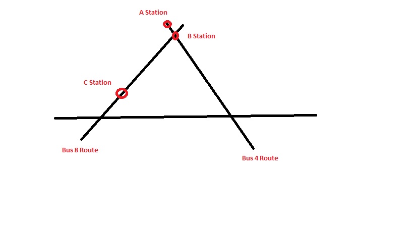 我有一个关于一个程序的Java算法的问题。我想写一个android程序,提供有关“巴士路线”的信息。程序工作时,用户选择一个汽车站(A站),程序对用户说:“乘4路公交车,然后下车B station.And,乘8路公交车,然后下车C站。”有人知道那个程序算法吗?我能用什么来节省每条公共汽车路线呢?Queue,stack或诸如此类的东西?我可以使用BFS或DFS算法来处理最短的公交线路吗?