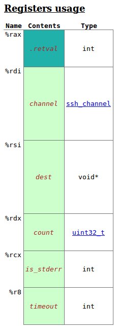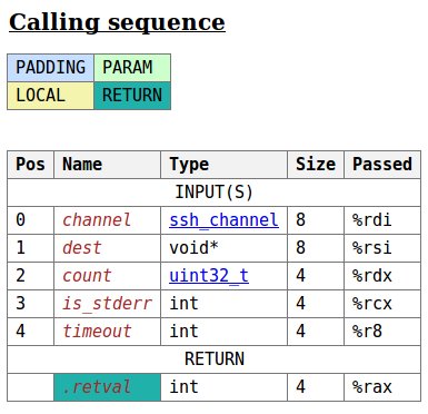 我最近创建了工具来可视化函数的堆栈框架、注册使用、结构化类型的内存布局和其他ABI信息。您可以查看libssh库函数ssh_channel_read_timeout on x86_64 这里的结果。