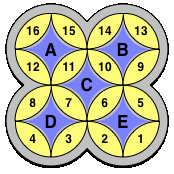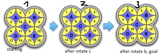 我想解决一个‘游戏’。我有5个圆,我们可以把圆圈转到左或右(90度)。