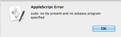 do shell script "sudo chmod u+s /usr/sbin/networksetup"因此,用户运行AppleScript并自动设置。但我得到了以下错误信息