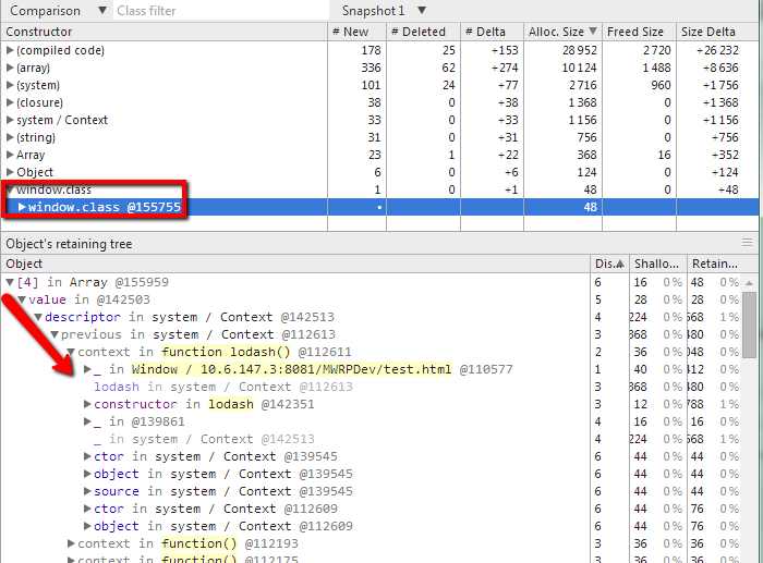 我希望obj实例不再是活动的,因为不再有对它的引用(唯一的引用是window.obj,但在最后一步中它被删除了)。但是,对两个堆快照的比较表明,对象仍然是活着的,似乎提交了对它的引用(在Chrome34.0.1847.131中进行了测试)。