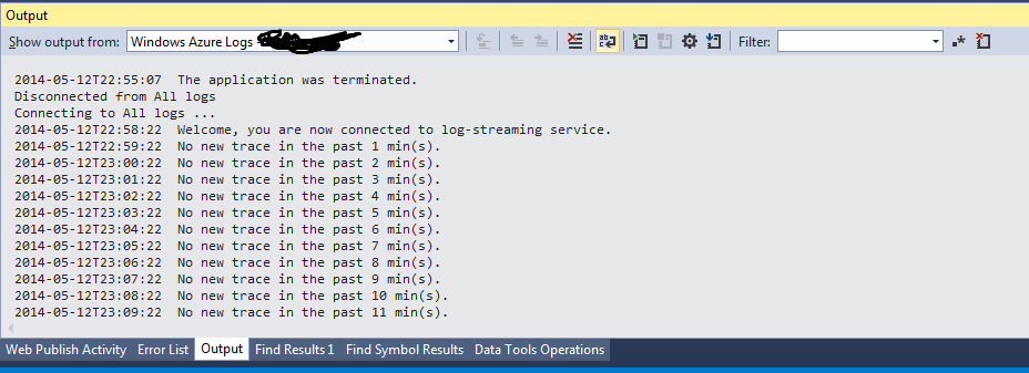 比这个问题晚了6个月。我注意到Trace.WriteLine("Hello“);-适用于Visual 2013更新4,但是-它不适用于Visual 2015 CTP 5。但是,如果附加调试器,则Trace.WriteLine(string)语句确实会出现在调试输出窗口中。当然,Azure网站设置必须设置为“详细”的应用程序日志记录。