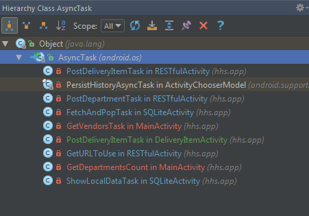 假设RESTfulActivity、SQLiteActivity、MainActivity和DeliveryItemActivity中列出的内部类都扩展了AsyncTask,那么第二个屏幕截图中的结果是完全可以预料的。AsyncTask不继承任何东西(显然,Object除外),而且您有9个类扩展了AsyncTask。因此,您有非常简单的层次结构: