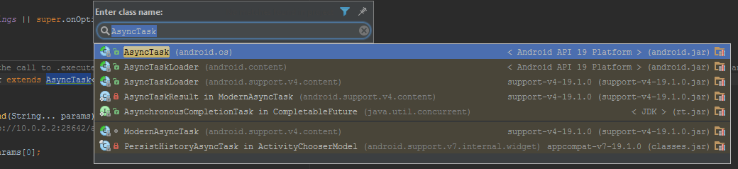 尽管如此,你发布的Drodio的功能并不是想要成为继承树。更确切地说,这是一种班级搜索。您已经高亮显示了AsyncTask,搜索结果显示了以"AsyncTask“开头的其他3个类,以"AsyncTask”结尾的两个类,以“异步”开头并以“任务”结尾的类(除了实际的AsyncTask类之外)。考虑到AsyncTask没有继承任何这些类(AsyncTask没有扩展或实现任何东西),这些类也没有从AsyncTask继承(在android.*中没有扩展AsyncTask的类),很明显,Drodio的这个特性与继承无关。