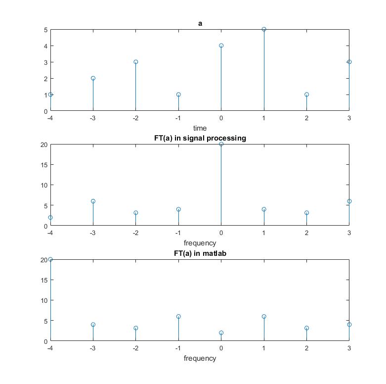 subplot(3,1,2), stem(x, fftshift(abs(A),2),'o'); title('FT(a) in signal processing'); xlabel('frequency')