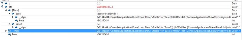 现在,您终于定义了一个类Derv,它继承自Base和Base2。这尤其意味着您可以让Base*和Base2*同时指向Derv类型的对象。现在,如果只有一个__vptr,pBase->say()和pBase2->lol()将调用相同的函数,因为它们都转换为(pXXX->__vptr[0])()。